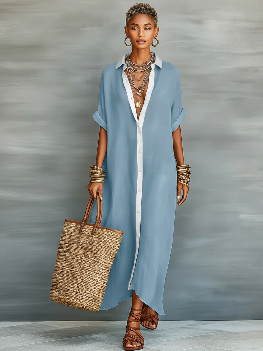 Women's Minimalist Linen Blend Short-sleeved Shirt Maxi Dress